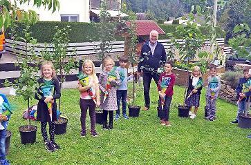 Im Vorfeld hatten sich die 13 Schulanfänger ihren persönlichen Lieblingsobstbaum aus den Sorten Pflaume , Apfel oder Kirsche ausgesucht. Nachdem nun die spannenden und aufregenden ersten Schultage vorbei sind und sich die Jungen und Mädchen hoffentlich schon an den Schulalltag gewöhnt haben, bekamen sie den von ihnen ausgewählten Busch, Halbstamm oder Hochstamm vom Obst- und Gartenbauverein (OGV) Steinberg geschenkt – als Schulbaum, der sie während ihrer Schulzeit beim Wachsen begleiten und ebenso reiche Frucht hervorbringen soll. Entsprechend groß war die Aufregung auf dem OGV-Vereinsgrundstück in der Weinbergstraße, wo den ABC-Schützen die Vorfreude förmlich ins Gesicht geschrieben stand.