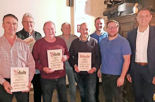 Mit einer Urkunde und einer Aufmerksamkeit wurden geehrt: Heinz Müller und Claus Häublein (beide für 40-jährige Mitgliedschaft), Hans-Joachim Volk (25 Jahre), Klaus Hannweber (15 Jahre) und Martin Appelt (zehn Jahre). Zudem dankte und würdigte man Artur Drechsler für 55-jährige und Norbert Roth für 30-jährige Treue.