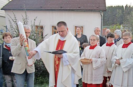 Die Auferstehung Jesu ist das Fundament christlichen Glaubens und wird mit der Osternachtsliturgie gefeiert, wobei die Lichtfeier, der Wortgottesdienst sowie die Tauf- und Eucharistiefeier fester Bestandteil sind. Zu Beginn des Gottesdienstes wird auf dem Kirchvorplatz am Osterfeuer die Osterkerze entzündet. Während der Lichtfeier zeichnet Pfarrer Michal Osak verschiedene Symbole auf die Osterkerze: Das Kreuz erinnert an den Gekreuzigten, die griechischen Buchstaben Alpha und Omega bezeichnen Christus als den Anfang und das Ende aller Dinge, die Jahreszahl zwischen den Balken des Kreuzes weist darauf hin, wie viele Jahre nach Christi Geburt vergangen sind, und die fünf Wachsnägel auf der Kerze sind schließlich das Symbol für die Wunden Christi .