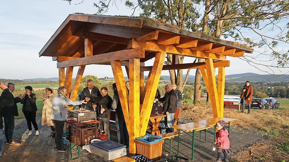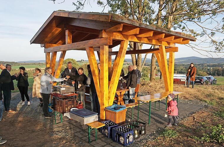 In freier Natur steht der stabile Pavillon 549 Meter über dem Meeresspiegel in der Christophsbühler Flur. Hier finden Wanderer Schutz, können sich ausruhen, Rast machen und haben dabei einen reizvollen Ausblick in die Landschaft des Fichtelgebirges und des Frankenwaldes. Der neue Pavillon fällt schon von Weitem durch sein begrüntes Dach auf. „Eine Sedumbepflanzung haben wir gewählt“, erzählt Projektleiter Andree Barth, „weil wir den Pavillon in freier Natur aufgebaut haben“. Nichts sei versiegelt worden. Die Kosten bezifferte Barth mit 15.000 Euro und führte weiter aus, dass 135 Stunden ehrenamtlich geleistet worden seien. Initiiert und gebaut hatte dieses Projekt die CSU-Fraktion mit Unterstützung vom Bauunternehmen „Schimmel Bau“.
