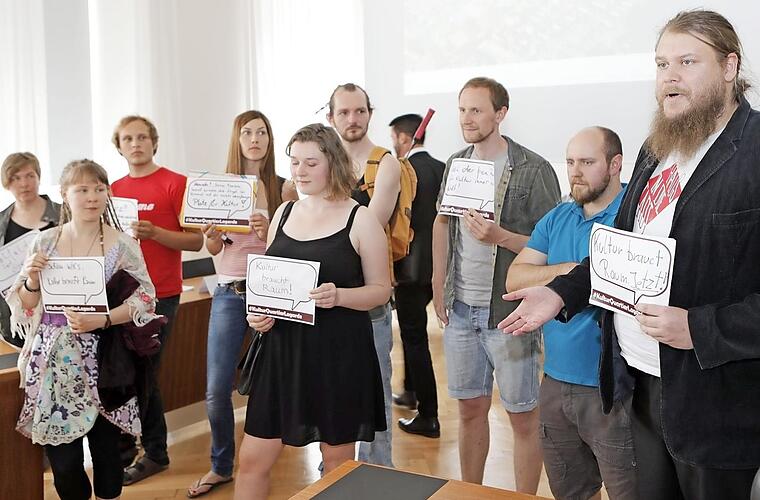 Mit einer Aktion vor der Sitzung des Konversionssenats äußerten die Organisatoren des studentischen Kulturfestivals ihre Wünsche bezüglich der Lagarde-Kaserne. Ihre Forderung: die schnelle Zwischennutzung eines Teils der Kaserne im direkten Anschluss an das Festival.