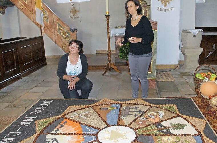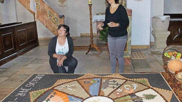 Ludwag — Sehenswert sind die Bilder, die Marika Arneth-Grasser und Hedwig Popp seit acht Jahren zum Erntedank vor dem Altar der Kirche St. Johannes der Täufer in Ludwag gestalten. Sie verwenden dafür verschiedenfarbige Körner. An vier Tagen und in etwa 40 Stunden haben die beiden Künstlerinnen des Jura das diesjährige Bild gelegt und geklebt. Es zeigt heuer das Motiv eines Jahreskalenders mit dem Titel "Durch das Jahr - durch das Leben". Für die zwölf Monate verwendeten Arneth-Grasser und Popp unter anderem Bilder der Hl. Drei Könige, der Kreuzigung, einen Kirchweihbaum, Sonnenblumen und Weintrauben bis zur Krippe im Dezember. Für das zwei auf drei Meter große Gesamtbild wurden Körner von 30 verschiedenen Früchten und Getreidesorten verwendet, u.a. Perserklee, Goldhirse, Futterrübensamen oder Monstranzbohnen. Die Bildränder wurden aus Nüssen oder Kastanien geklebt. Das Erntedankbild ist noch bis kurz vor Allerheiligen zu besichtigen. Foto: Joseph Beck