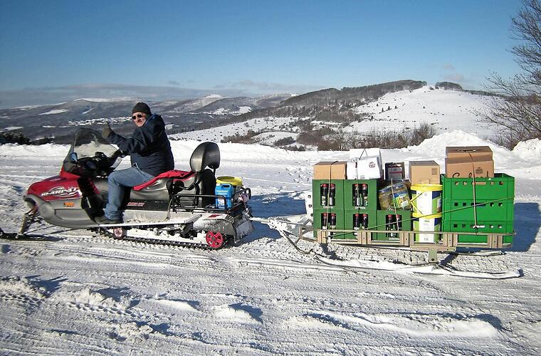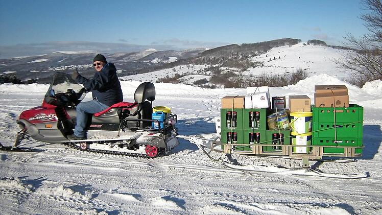 Der Winter hat seine eigenen Gesetze. Zwar herrschen in den Skigebieten in der Rhön beste Pistenverhältnisse und Fernsicht bei Sonnenschein. Zur Versorgung der Gemündener Hütte am Kreuzberg ist aber jetzt der Motor-Schlitten notwendig, will man die schweren Waren nicht hochtragen. Denn für einen Pkw ist die Schneedecke zu hoch. Foto: ssp