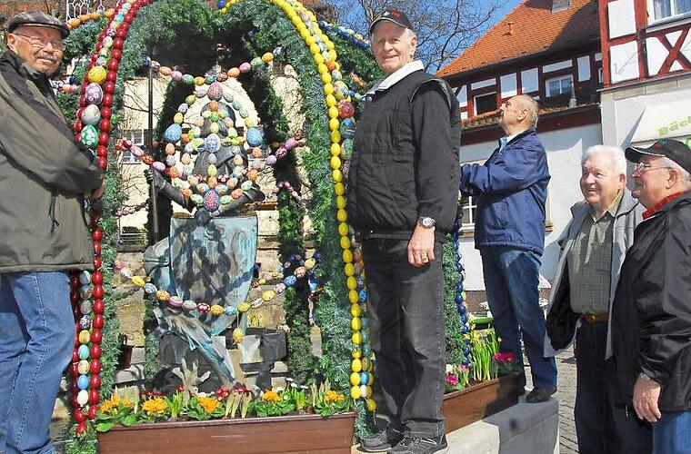 Zum 18. Mal gestalteten die Ina-Senioren um Werner David am Freitag den Osterbrunnen auf dem Marktplatz. Und es soll auch das letzte Mal gewesen sein, wie der 84-Jährige Chef der Gruppe erläuterte. "Irgendwann muss mal Schluss sein", sagte er. Und hoffte, dass sich die Stadt der Tradition annehmen möge, damit der Georgsbrunnen auf dem Marktplatz auch weiterhin einen Osterschmuck hat.