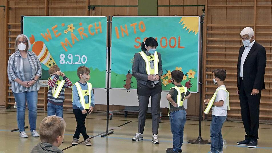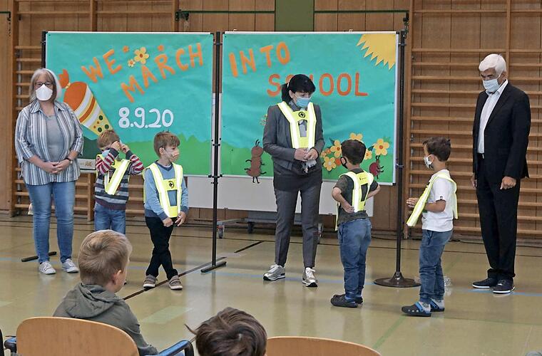 Am zweiten Schultag war Wolfgang Gerstberger, Vorsitzender der Gebietsverkehrswacht Herzogenaurach, in die Schule gekommen, um in der Turnhalle zusammen mit der Schulleiterin Heidi Forisch und der Konrektorin Silvia Eder den Schulanfängern die Sicherheitstrapeze, gesponsert von der Sparkasse, zu übergeben.