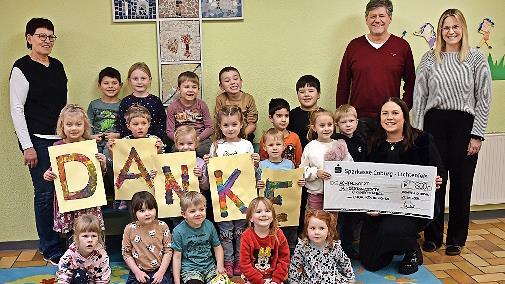 Freudiger Anlass war der Besuch des Chors Route 16-60 mit Zweiter Vorsitzender Svenja Weid und stellvertretendem Chorleiter Uwe Stegner in der Kita Grünschnabel. Sie überreichten eine Geldspende von 800 Euro. Zusammengekommen ist der Betrag aus dem Erlös des Weihnachtskonzerts des Chors, ließ Weid wissen. Für das Konzert war kein Eintritt verlangt worden. Die Besucher spendeten freiwillig einen Betrag. Kita-Leiterin Daniela Rech freute sich über die Spende. Das Geld werde zielgerichtet verwendet. Die Kinder drückten mit einem fröhlichen Lächeln ihren Dank und ihre Freude aus. Sie revanchierten sich mit Fruchtbonbons und Lachgummis für den Chor.