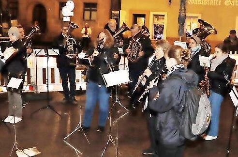 Nach dem Gottesdienst ging es hinaus auf dem Marktplatz. Die Frage, wie wohl der Weihnachtsbaum 2025 dort aussehen würde, hatte sich schnell geklärt: Zwar nicht von ganz großer Statur, aber in wunderschöner Form stand er da. Mit dem Segen von Pfarrer Christian Montag wurden die Lichter mit einem „oh“ und „ah“ und dem Choral der Blasmusik, „Oh Jubel oh Freud“, eingeschaltet.