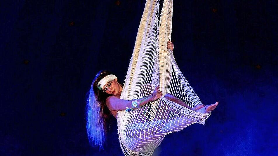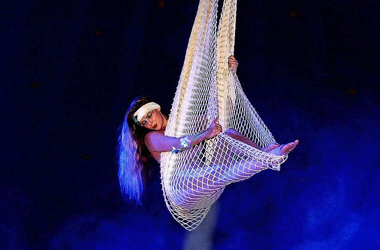 Josy Renz beeindruckt am rotierenden Vertikalseil, und 15 Meter unter der Circuskuppel zeigt Natascha Köllner ihr Können an seidenen Tüchern.