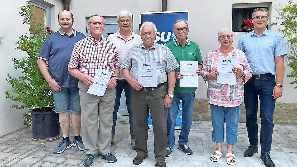 Im Rahmen der Jahreshauptversammlung der CSU Ebensfeld sprachen Ortsvorsitzender Anton Schatz und sein Stellvertreter Horst Amon ein herzliches Dankeschön für langjährige Treue zur CSU aus. So ist Rosemarie Swieca 25 Jahre in der CSU , Siegfried Dinkel wurde für 40 Jahre Treue geehrt, Toni Stärk und Georg Jung wurden sogar für 60 Jahre Mitgliedschaft ausgezeichnet. Erster Bürgermeister und zugleich stellvertretender CSU-Kreisvorsitzender Bernhard Storath gratulierte den Geehrten und dankte der Vorstandschaft für ihren großen Einsatz um die Ebensfelder CSU . Eine besondere Auszeichnung wurde Georg Jung , Toni Stärk und Siegfried Dinkel zuteil: Für außerordentliches, jahrzehntelanges Engagement wurden sie zu Ehrenmitgliedern ernannt. red
