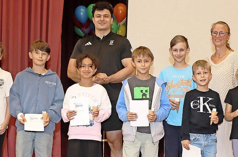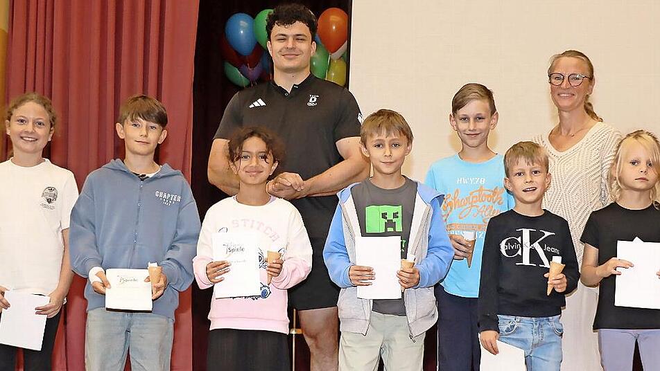 Dann freute sich der Athlet. die Jahrgangsbesten der Friedrich-Baur-Grundschule bei den Bundesjugendspielen auszuzeichnen, bei denen er vor Ort war. Die Mädchen und Jungen erhielten aus seinen Händen Urkunden. Auch er habe einmal klein angefangen, meinte er dazu mit einem Schmunzeln, als die Sieger mit einer gewissen Ehrfurcht vor ihm Aufstellung nahmen.