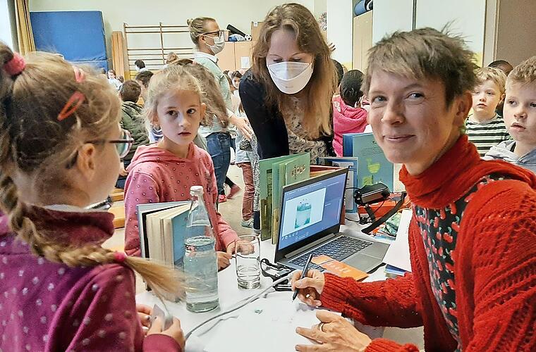 Das merkt man auch darin, wie sie den Kindern begegnet: Voller Respekt und Neugierde. Ihnen wiederum erklärt sie außerdem, was ein Autor und ein Illustrator genau machen und wie die Tiere auf ihrem Bauernhof ihre Geschichten beeinflussen. So bekommen die Schüler etwa Fotos der beiden Wollschweine zu sehen, die für die Geschichte „Krümel und Fussel“ Pate standen.