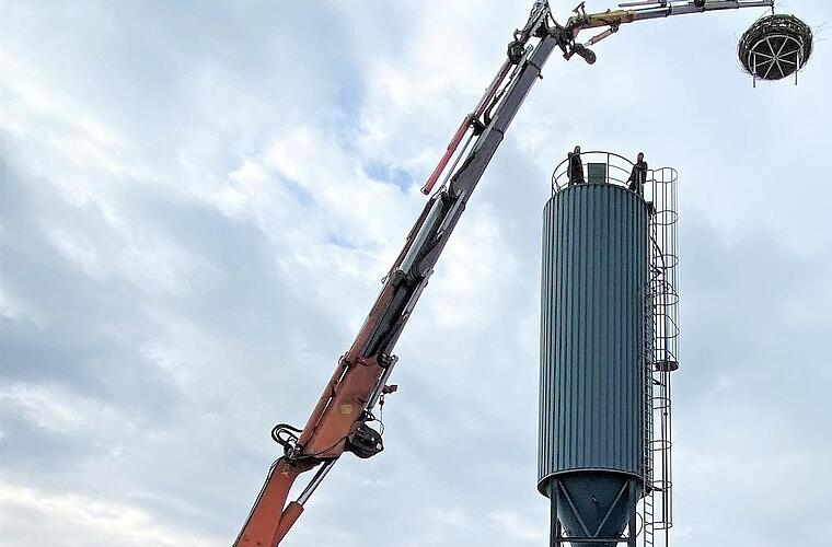 Das Nest besteht aus einem Metallgestell und Naturmaterialien wie Weide und steht seit vergangenem Freitag an Ort und Stelle. Meister Adebar ist nun in diesem Horst herzlich willkommen und findet auf dem hohen Turm ideale Brutmöglichkeiten vor.