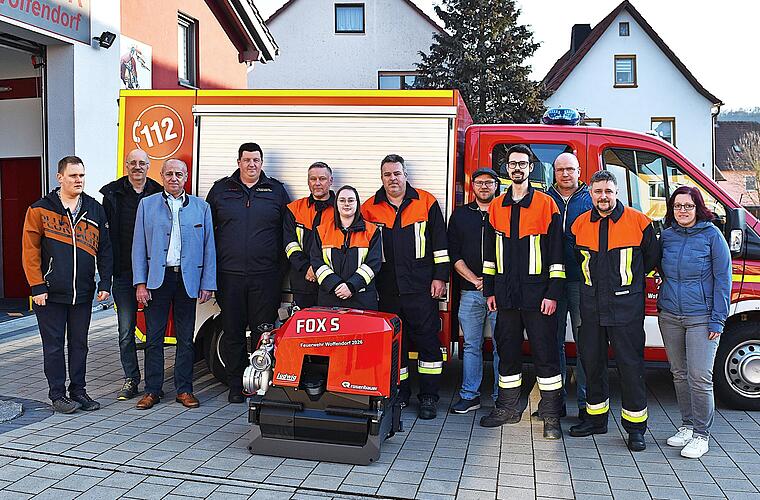 Alle Führungskräfte der Freiwilligen Feuerwehr von Woffendorf, Bürgermeister Robert Hümmer und Mitglieder der Stützpunktwehr hatten sich am Feuerwehrhaus eingefunden, wo das neue Einsatzgerät angeliefert wurde.