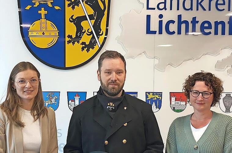Wurde für sieben Jahre verpflichtet: der bevollmächtigte Bezirksschornsteinfeger Benjamin Mayer mit Abteilungsleiterin Kristin Grosch (r.) und Sachbearbeiterin Corinna Schuberth-Weber (l).