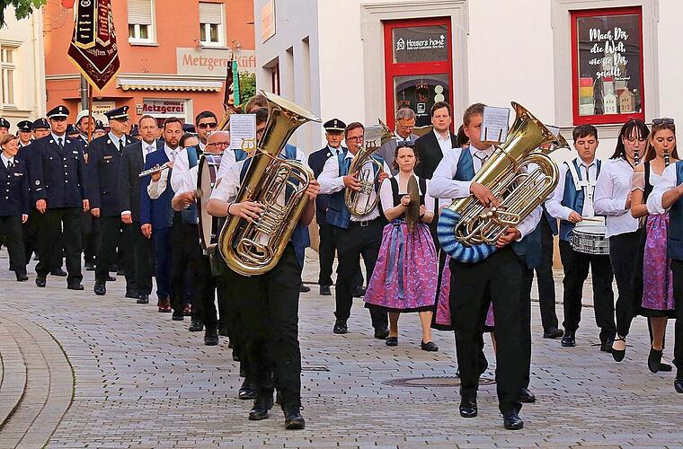 Im Anschluss an den Gottesdienst bot sich der Bevölkerung ein imposantes Bild, als die Feuerwehren, angeführt von der Uetzinger Blaskapelle, von der Pfarrkirche über die Bahnhofstraße und Goethestraße zur Peter-J.-Moll-Halle marschierten.