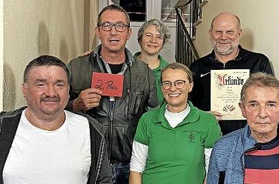 Die drei Punktbesten nahmen erfreut aus der Hand der Vorsitzenden der Kelbachtaler Blasmusik Prächting die ausgesetzten Geldpreise entgegen (v. l.): der Gesamtsieger Holger Morgner, der zweitplatzierte Tano Motios, Vorsitzende Dagmar Sommer, Vorst...