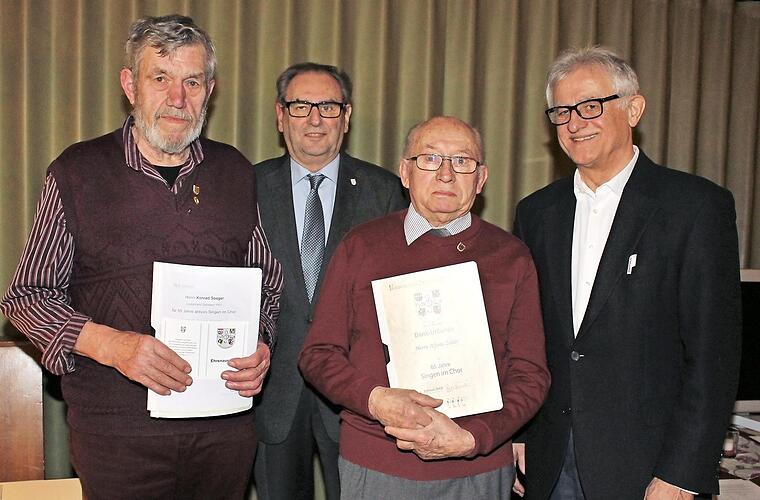 Um zwei "Urgewächse des Chorgesangs" auszuzeichnen, hatte sich Peter Märkel, Vorsitzender des Sängerkreises Bamberg und Vizepräsident des Fränkischen Sängerbundes, eingefunden. Mit Ehrennadeln und Urkunde sprach er Konrad Seeger den Dank des Fränkischen Sängerbundes und des Deutschen Chorverbands für 50 Jahre Singen im Chor aus. Ehrenvorsitzender Alfons Zeiler, der dem Verein seit der Gründung angehört, wurde sogar für 65 Jahre Singen im Chor ausgezeichnet. Mit dem Liederkranz Sambach verbinde er viele schöne Erinnerungen, sagte Peter Märkel. Er bedauere, dass die Zahl der Männerchöre immer kleiner werde.