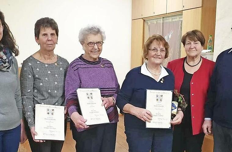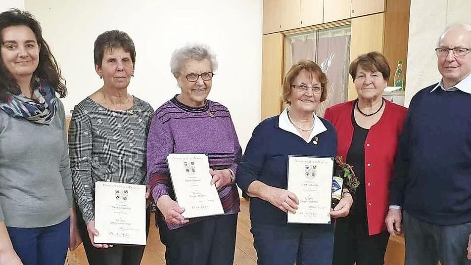 Im Anschluss wurden Frieda Hofmann, Gunda May und Renate Rückel ausgezeichnet, die dem Chor seit 50 Jahren angehören. Für langjährige Mitgliedschaft im Verein wurden Cornelia Wichert (10 Jahre), Stefan Maar und Manfred Schubert (beide 25 Jahre), Markus Huber (40), Doris Schickert (50) und Hans Sapper (60 Jahre) geehrt.