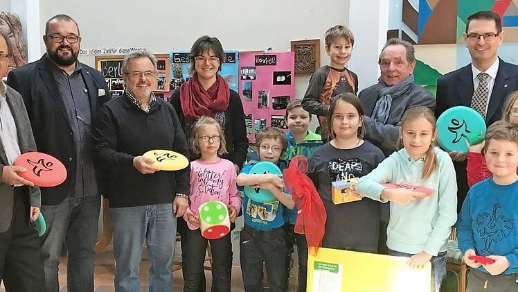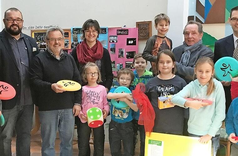 Für eine große Überraschung sorgte der Lions Club Lichtenfels mit seinem Präsidenten Johannes Morhard, Schatzmeister Karlheinz Wirth, Vorstandsmitglied Volker Hamann und dem Vorsitzenden der Freunde und Förderer des Lions Clubs, Walter Mackert, in den beiden Förderschulen in Lichtenfels. Sie überreichten nämlich den Schülern der Sankt-Katharina-Schule und der Maximilian-Kolbe-Schule zwei Bewegungskisten im Wert von insgesamt über 500 Euro, die zahlreiche Spielgeräte enthalten wie verschiedene Bälle aus unterschiedlichen Materialien, Softfrisbees, Springseile und Schwungtücher. Die Spiele eignen sich zum Bewegungs- und Wahrnehmungstraining und für Therapiezwecke. Foto: Alfred Thieret