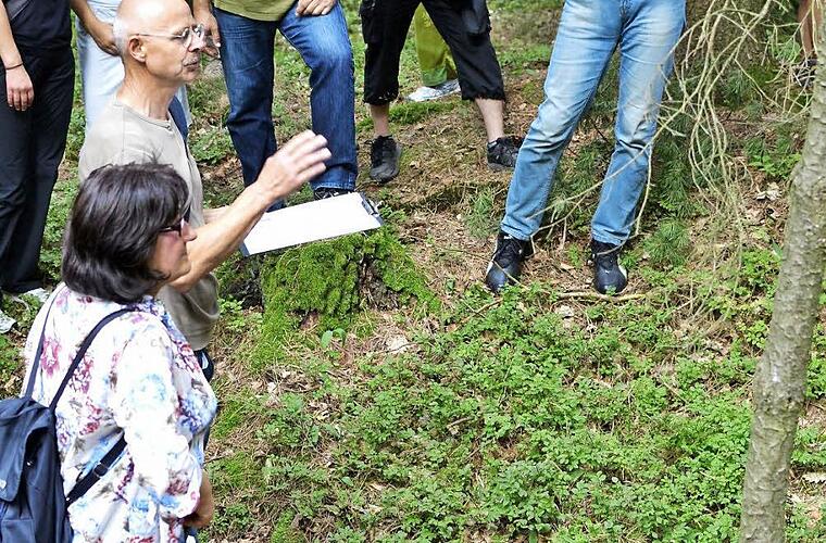 Schon der Ausgangspunkt dieser Exkursion am Parkplatz zwischen Spiesberg und Zeub litz hatte einen historischen Hintergrund, denn hier steht ein markanter Kreuzstein, den das CHW vor einigen Wochen wieder zugänglich gemacht hat, nachdem er im Boden eingesunken und gekippt war. Er erinnert vermutlich als ein Sühnestein an den Ort eines Verbrechens und wurde einst wohl gesetzt, um der Blutrache zu entgehen.