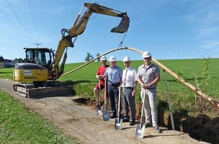 Zum symbolischen Spatenstich trafen sich Bürgermeister Franz Uome, Bauamtsleiter André Weber sowie Claus Schreyer und Alexander Baumer von der Firma Günther-Bau an der Baustelle. Von der Kläranlage führt die Druckleitung bis an die Kreisstraße KU 13, quert diese und verläuft dann entlang des Ortsverbindungsweges von Neuensorg bis zum Einlauf in die Marktleugaster Ortskanalisation in der Kreuzgasse oberhalb der Dreifachsporthalle.