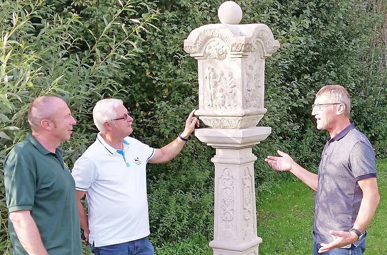 In neuem Glanz strahlt die Sandsteinmarter am Leutnitztal. Durch eine Reinigung und Imprägnierung von professioneller Hand wurde das Schmuckstück am westlichen Ortsausgang der Flößerstadt vor weiterer Verwitterung bewahrt. Dies ermöglicht hat die Ortsgruppe des Frankenwaldvereins (FWV), die sich um die Pflege des Areals rund um das NaturErlebnis Leutnitztal kümmert. Sie beauftragte Restaurator Wilhelm Keim mit dem Entfernen von Algen, Moosen und Flechten, die sich seit der Generalsanierung der Marter im Jahr 1983 gebildet hatten. Auch die verwitterten Schutzanstriche früherer Jahre wurden entfernt. Der fränkische Sandstein, der bereits bei der Errichtung des religiösen Denkmals im Jahr 1774 verwendet wurde, dürfte nach Schätzungen des Fachmanns mehrere Hundert Millionen Jahre alt sein. Sandstein hat die Eigenschaft, sich leicht mit Feuchtigkeit vollzusaugen und diese nur langsam abzugeben. Behutsam reinigte Keim die mit Grünbelag etwas unansehnlich gewordene Säule. Lediglich einige abgestorbene Flechten durften bleiben. "Durch die Maßnahme wurde die Oberfläche des Denkmals wieder steinsichtig", so der Restaurator. Gemeint ist damit das Hervortreten der ursprünglichen hellen Farbe des Sandsteins. Versehen mit einer neuen Imprägnierung zum Schutz gegen Algen hebt sich die Steinmarter, die sich im städtischen Besitz befindet, nun wieder vom Grün des Bachufers der Leutnitz ab. Obmann Jürgen Schlee vom FWV zeigte sich beeindruckt, wie wunderbar sich die gereinigte Steinsäule nun wieder im Landschaftsbild zeigt. Als ein wertvolles Zeichen christlichen Glaubens bezeichnete Ortsheimatpfleger Franz Behrschmidt, der den Kontakt zu Restaurator Keim hergestellt hatte, die Sandsteinmarter. Er dankte dem FWV für sein Engagement um den Erhalt der heimischen Kulturgüter.