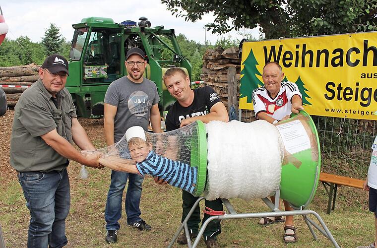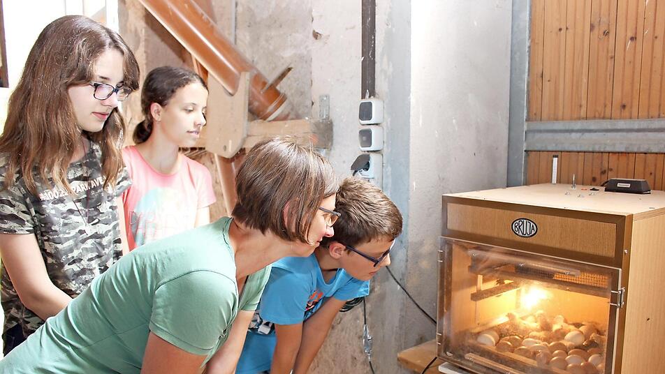 Auf dem Geflügel- und Straußenhof Gumbrecht war am frühen Nachmittag kaum noch ein Durchkommen. Nicht nur der Sitzbereich war voll, denn dort gab es traditionell fränkische Spezialitäten. Ständig umlagert waren die vielen Volieren, Käfige, Brutkästen und Ställe mit Hühnern, Küken, Enten, Gänsen, Straußen, Kaninchen und sogar mit ganz jungen Kätzchen. Die meisten Bewunderer waren natürlich Familien mit Kindern. So ein wollig weiches Küken in die Hand zu nehmen, war für viele ein Erlebnis. Noch viel mehr vielleicht, zuzusehen, wie aus einem Ei ein Küken schlüpft.