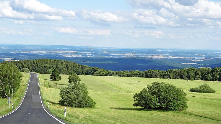 In diesen Tagen ist die Fernsicht besonders gut und das Land der offenen Fernen wird seinem Ruf mehr als gerecht. Von der Hochrhön lässt es sich weit bis ins Land blicken und die Orientierung fällt auch nicht schwer. Bad Neustadt ist anhand des weißen Quaders der Firma Kunert gut auszumachen.    Foto: Marion Eckert