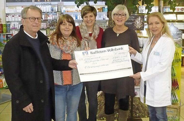 Angelika Woll, die Präsidentin des Lions-Clubs Festung Rosenberg Kronach, überreichte in den Räumen der Süd-Stern-Apotheke die stattliche Spende von 1000 Euro an den Kindergarten Fridolin in Hummendorf. Bestimmt ist das Geld zur Anschaffung besonderer Bewegungsspielgeräte für die dortigen Kindergartenkinder.