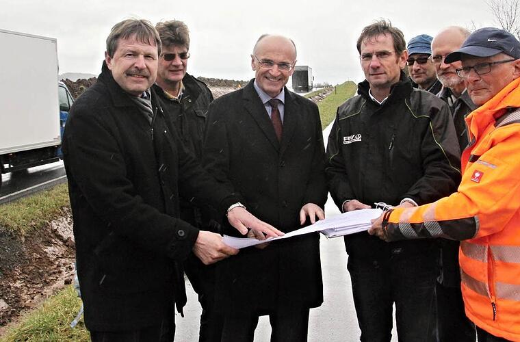 Der Landrat war zeitig da, blieb aber, wie alle anderen auch, in seinem Auto sitzen, um sich nicht schon vor Terminbeginn den Unbilden des Wetters auszusetzen. Schnelles Ausführen der Arbeiten, um die Beeinträchtigungen des Verkehrs nicht zu lange hinnehmen zu müssen, aber auch gute Qualität, wünscht sich der Landkreischef, wie er vor Ort sagte. "Der Landkreis möchte trotz angespannter finanzieller Verhältnisse sein Straßennetz in Schuss halten", sagte Wilhelm Schneider.