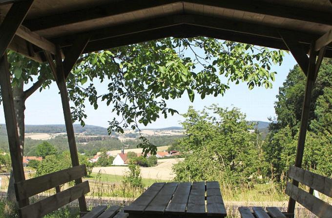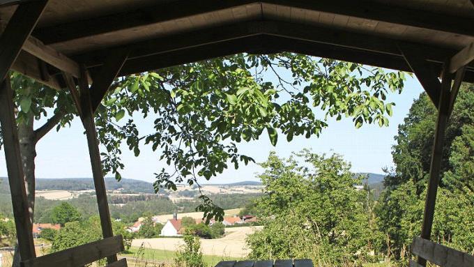 Ein neuer Aussichtspunkt und Rastplatz lädt neben der Verbindungsstraße Schönbach-Steinbach seit kurzer Zeit zum Verweilen ein. Die Vorsitzende des Obst- und Gartenbauvereins in Schönbach, Ingrid Markert, konnte handwerklich geschickte Mitglieder dazu motivieren, eine Sitzgruppe mit Bedachung oberhalb von Schönbach mit einem herrlichen Blick auf den Veitenstein und die Haßberge in Richtung Breitbrunn zu erstellen. Die Firma Hartlieb aus Stettfeld lieferte das benötigte Material für den Umbau kostenlos. Die neue Sitzgruppe gewährt einen schönen Blick auf das Dorf und die Haßberge-Höhen. Foto: Günther Geiling