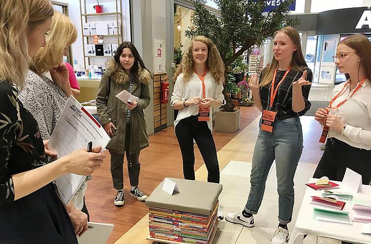 Am dritten Tag erfolgte dann der Transport des "Bücher-Hockers" zur Shopping-Mall "Domina", wo die Schüler ihren Messestand aufbauten. Verschiedene Jurys beurteilten dabei die Firmenprodukte in sieben Kategorien und die Schüler mussten auch Fragen beantworten. Dann ging es unter großer Anspannung zur Preisverleihung, bei der sechs Awards vergeben wurden.