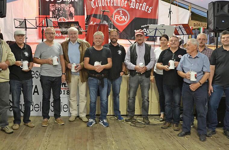 Frank Wich ehrte im Anschluss Vereinsmitglieder für ihre langjährige Treue. Eine besondere Freude und Ehre war es ihm, eine langjährige Stütze des Vereins und guten Freund, das Gründungsmitglied Harald Wagner, für 50 Jahre Mitgliedschaft zu ehren. Gänsehaut gab es zum Abschluss, als die Dörfleser Musikanten zusammen mit allen das von Christoph Wagner 1970 gedichtete Dörfleser Clublied "Wir sind ein Club so froh und frei ...", und anschließend die offizielle FCN-Hymne "Die Legende lebt" sangen.