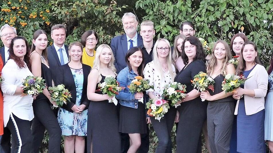Sowohl Etzel als auch Kolck waren erfreut darüber, dass die 18 Azubis den Krankenhäusern in Haßfurt und Schweinfurt erhalten bleiben. Stefan Heilmann dankte im Namen der Auszubildenden allen Lehrkräften und übergab Blumengrüße, unter anderem an den langjährigen Schulleiter Udo Burger, der sich in den Ruhestand verabschiedet.