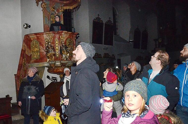 Und die Erwartungen wurden übertroffen, die beiden Initiatorinnen waren überwältigt. Über 40 Väter und Mütter, Omas und Opas waren mit Kindern und Enkeln in der Wallfahrtskirche erschienen, die dann mit Taschenlampen die Kirchenführerin Annette Urban zu den interessanten und kunstvollen Sakralfiguren, Bildnissen und Schätzen dieses fast 300 Jahre alten Gotteshauses begleiteten und deren Ausführungen aufmerksam verfolgten.
