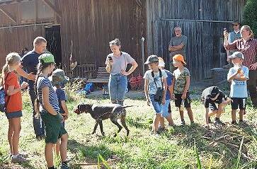 An den Aussiedlerhöfen vorbei kam die Gruppe zur zweiten Station, der Betriebshalle der Baumschule Schlereth, wo ein kleiner Imbiss gereicht wurde. Julian Grundhuber vom Amt für Ernährung, Landwirtschaft und Forsten demonstrierte hier mit seinem Hund die Wasserarbeit sowie das Erarbeiten einer Schweiß-Fährte. Dabei versuchten die Jäger den Unterschied zwischen einem Jagdhund und einem unkontrolliert streunenden "Spaziergänger-Hund" deutlich zu machen. Zwei weitere Kilometer endeten an der "Herrenmühle" womit rund fünf Gesamtkilometer, eingeschlossen etliche Höhenmeter, bewältigt waren. Für manche Mädchen und Jungen ein gehöriger Kraftakt bei tropischen Temperaturen. Am Stadtmuseum, wo sie ihre Eltern abholten, verabschiedeten sich die müden, jungen Wanderer beim Hörner-Klang der Bläsergruppe des BJV Hammelburg. Für alle gab es eine Teilnahmeurkunde und einen Beutel mit Informationsmaterial. Die Jäger planen aufgrund des Interesses, diese Veranstaltung im nächsten Jahr zu wiederholen.