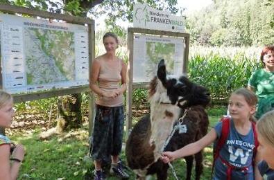 An der Schneidmühle gab es eine große Überraschung, denn Tanja Sünkel mit ihrer kleinen Wandergruppe und zwei Lamas von der Kurklinik Salem begleiteten jetzt den Ausflug. Gerne wurden Fragen zu den Tieren beantwortet. Stadtsteinachs Bürgermeister Roland Wolfrum begrüßte die wackere Schar und spendierte allen ein Erfrischungsgetränk. Die Wanderführer des Frankenwaldvereins Hilde und Sepp Madl erzählten die Geschichte vom Zerfall einer Mühle, der alle gespannt lauschten.