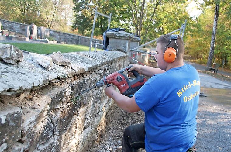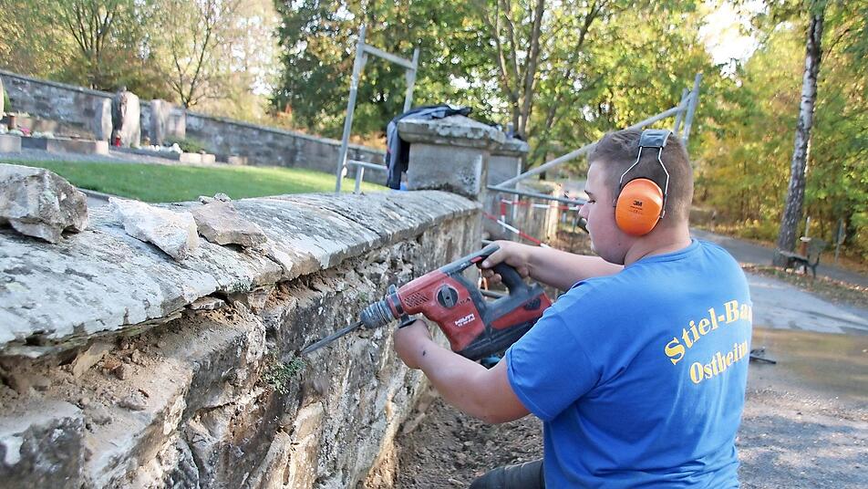 Mit der Sanierung der Friedhofsmauer werden jetzt die letzten Arbeiten zur Umgestaltung des Fridritter Friedhofs durchgeführt. Wegen der guten Auftragslage habe es ein wenig länger gedauert, sagt Friedhofsreferent Klaus Schebler (Neue Wege). Nun sind Mitarbeiter der Firma Stiel aus Ostheim vor Ort. Die Friedhofsmauer wird rechts und links des Eingangs komplett durchbohrt und anschließend eine Verankerung eingesetzt. So wird die Mauer wieder stabilisiert. Gleichzeitig werden die Fugen komplett herausgemeißelt, die Mauer in sich verfüllt und verpresst. Zum Schluss wird die Mauer wieder verfugt. Rund 20 000 Euro kostet die Sanierung und Stabilisierung der Mauer.