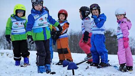 Endlich Schnee! In bunten Overalls, mit Helmen und Skibrillen ausgestattet, übt eine Gruppe Vier- bis Neunjähriger an einem Hang unweit des Wanderparkplatzes Romansthal, wie man sich auf der Skipiste richtig bewegt. Die Kinder haben ihre Freude am Ausprobieren. Jürgen Paul und Florian Wagner von den Staffelsteiner "Naturfreunden" sind als Ausbilder dabei.