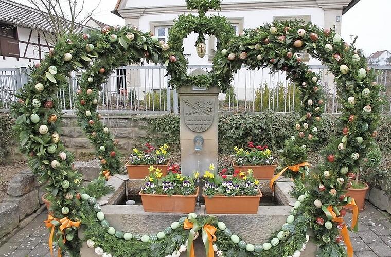 Auch am historischen Dorfbrunnen in der Ortsmitte von Pautzfeld legten die Mitglieder des Gartenbauvereins Hand an und verwandelten ihn in einen farbenprächtigen Osterbrunnen.