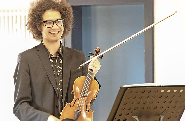 Abel Cruz Lezama, Student aus Spanien, Anfang 20, Arrangeur, Komponist und exzellenter Geiger, versprach dem Publikum einen Crossover von der Klassik bis zur Rockmusik. Die ungefähr 60 bis 70 Menschen im Gemeindesaal, etwa jeweils zur Hälfte Flüchtlinge und Deutsche, waren gespannt.
