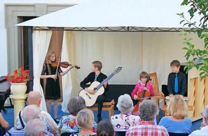 Konzerte im eigenen Garten - die Idee hatte die Familie Kreuzer schon länger. Die sechsköpfige musikalische Familie bewohnt seit einigen Jahren das historische Pfarrhaus und nutzt den Pfarrgarten. Vor der beeindruckenden Kulisse des Gebäudes hatten die Kreuzers eine kleine Bühne mit Pavillon gebaut. Die Wiese war mit Stühlen und Bänken bestückt, so dass dem ersten Open-Air-Konzert nichts im Weg stand. Die vier Kinder der Familie gestalteten den Abend mit verschiedenen Stücken und Instrumenten. Maximilian (Gitarre), Antonia (Violine), Katharina (Violoncello) und Kornelius (Marimbaphon) spielten Auszüge aus ihren Programmen, die sie für "Jugend musiziert" einstudiert hatten und mit denen alle erfolgreich waren (teilweise bis zum Bundeswettbewerb). Es war auch ein kleines Dankeschön an die Wermerichshäuser, da die Familie sogar bei offenem Fenster üben und musizieren kann, ohne dass sich irgendjemand daran stört. Dieses Konzert war zudem ein Test, ob das Konzept funktioniert.