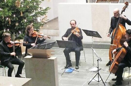 Es war für ihn eine Bestätigung für die Veranstaltung, dass die Zuhörer immer wieder gerne mit Musik ihre Zeit verbringen, viele schon zum wiederholten Mal. Vielleicht liege es daran, dass die Harmonie den Raum mit schönen Klängen füllt. In diesem Jahr hatte sich Fink fünf Mitglieder des Orchesters "ventuno" nach Herzogenaurach geholt, Bernd Müller und Valentina Pilny (Violine), Christopher Scholz (Viola), Martin Matos Mendoza (Violoncello) sowie Stephan Goldbach (Kontrabass). Sie standen für ein musikalisches Feuerwerk an diesem Abend. "Für heute darf ich mich von Ihnen verabschieden, denn die Moderation des Abends hat Bernd Müller übernommen", so Fink. Müller kündigte den Zuhörern ein schwungvolles und spritziges Programm an.