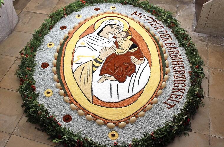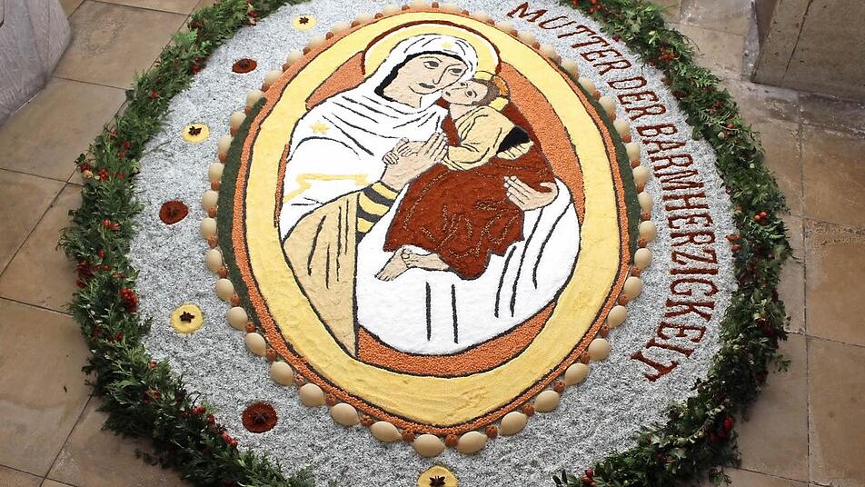 "Mater Misericordiae", die Mutter der Barmherzigkeit, zeigt der diesjährige Erntedankteppich in der Elsendorfer Kirche Sankt Laurentius. Passend für das "Jahr der Barmherzigkeit" hatte der Ortsgeistliche, Pater Gabriel Ramos Valiente, dieses Meditationsbild ausgewählt. Maria trage Gottes Barmherzigkeit und Besorgtheit für die Menschen im Herzen, heißt es im beigefügten Text.
