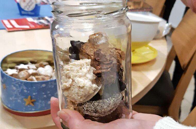 Im Sinne der Nachhaltigkeit haben die Bäckerinnen unter der Organisation von Elke Kober die Plätzchen in Gläsern verpackt, anstatt wie bisher in Plastiktüten. Dies schont zu einem die Umwelt und sieht nach Ansicht der Verantwortlichen besonders weihnachtlich aus. Einen weiteren Vorteil habe die wiederverwendbare Verpackung auch: Die Plätzchen halten besonders lange, wenn sie nicht gleich vernascht werden.