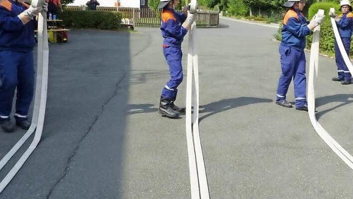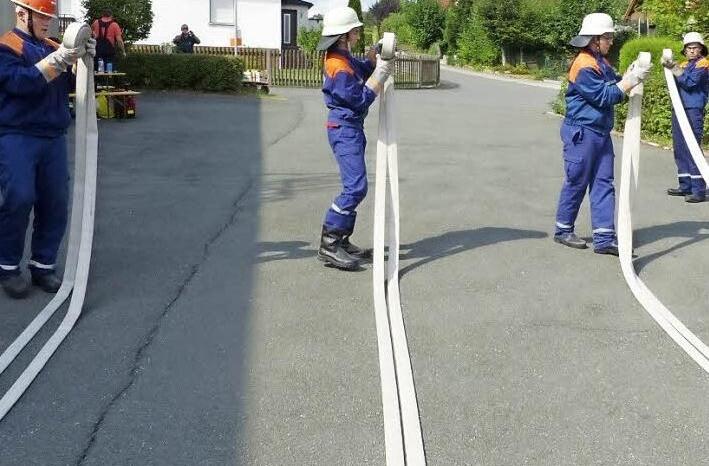 Da galt es, eine 60 Meter lange Schlauchleitung in Windeseile zu kuppeln oder den Partner mit einem Brustbund zu sichern. Gutes Auge und Geschick waren beim Leinenbeutel-Zielwerfen gefragt.