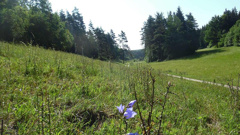 Letzterer leitet zunächst auf einem ansprechenden Feldweg am Steinbruch entlang, ehe man zunächst links, dann rechts abbiegt und geradeaus auf ein Wäldchen zusteuert. Durch dieses gelangt man auf einen Pfad, teils in unmittelbarer Nähe zur Abbruchkante des Steinbruchs, zur Ortsverbindungsstraße nach Uetzing, die überquert wird. Geradeaus weiter, nach etwa 200 Metern an der Weggabelung mit Hinweistafel T 2044, beginnt links der grüne Querstrich, welcher die nächsten eineinhalb Kilometer den Wanderer begleiten wird. Der Feld- bzw. Waldweg mündet bald in einen Pfad, der nach einer Wiesenpassage erneut in den Wald eintaucht. Nach diesem herrlichen Streckenabschnitt trifft man wieder auf den blauen Querstrich, an dem man sich die nächsten zwei Kilometer orientieren wird. Kurz vor Erreichen des Pfadfinder-Zeltgeländes biegt man links ab, quert die Ortsverbindungsstraße nach Rothmannsthal und befindet sich nun im so genannten Oberen Köttler Grund. In der Stille der Natur geht es im Grunde immer geradeaus, ehe man links, am Rand eines Fichtenwäldchens, abbiegt.