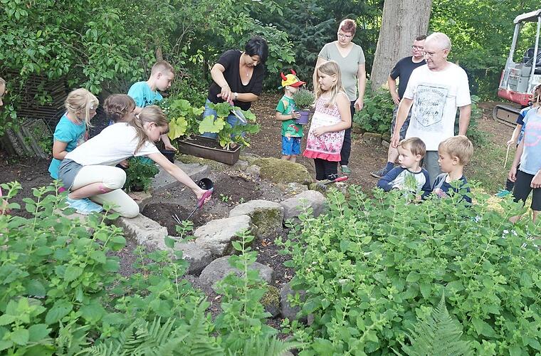 Im Küpser Gemeindeteil Burkersdorf wurden die "Naturfrüchtchen" aus der Taufe gehoben. Die Nachwuchsgärtner werden gleich aktiv und pflanzen fleißig.