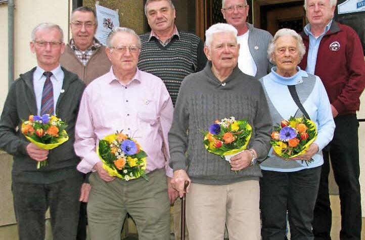 Ehrennadeln, Urkunden und ein Blumengruß gingen in Gold für 40 Jahre an Herbert Brückner und Fritz Koch, in Silber für 25 Jahre an Dieter Marr, Helmut Großmann, Gerhard Hofmann und Martin Zimmer, in Bronze für 15 Jahre an Anni Köhler und Folker Koch.