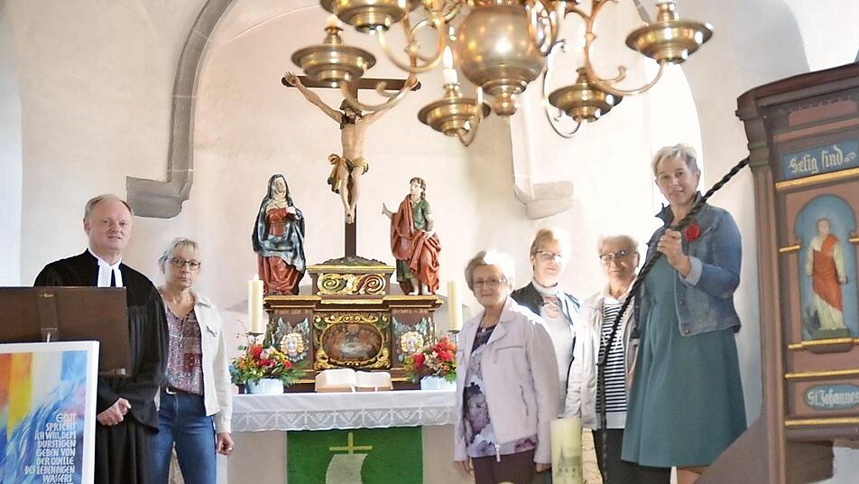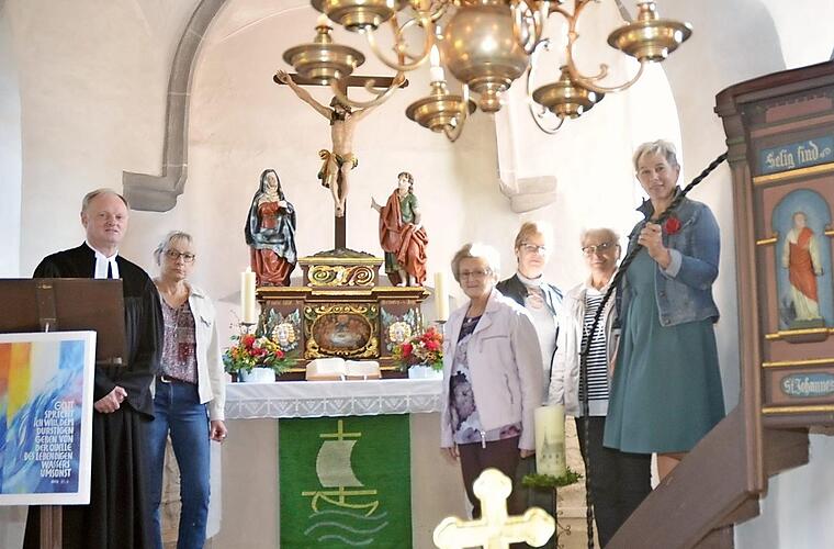 Die Frauen der Kirchengemeinde Burkersdorf-Hain spendeten für die Dreifaltigkeitskirche zwei grüne Paramente im Wert von 1200 Euro. In einem Festgottesdienst wurden die handgestickten Paramente von Pfarrer Reinhold König gesegnet. Das Bild zeigt Pfarrer Reinhold König (links), Vertrauensfrau Renate Ammon (Vierte von rechts) und stellvertretende Vertrauensfrau Sabine Siegelin (rechts). Foto: K.-H. Hofmann